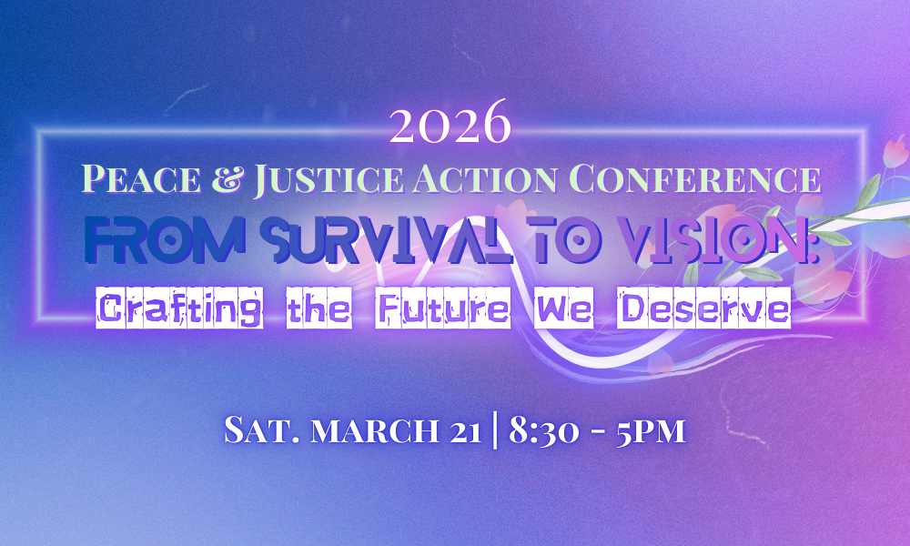 The 2026 Peace and Justice Action Conference will focus on going beyond reaction and into response. Grounded in real-world struggle and guided by imagination, we will explore how care, creativity, strategy, and solidarity can shape futures rooted in dignity, justice, and collective well-being. Together, we will strengthen our analysis, sharpen our tools, and deepen our relationships, not to survive what is, but to craft what should be.